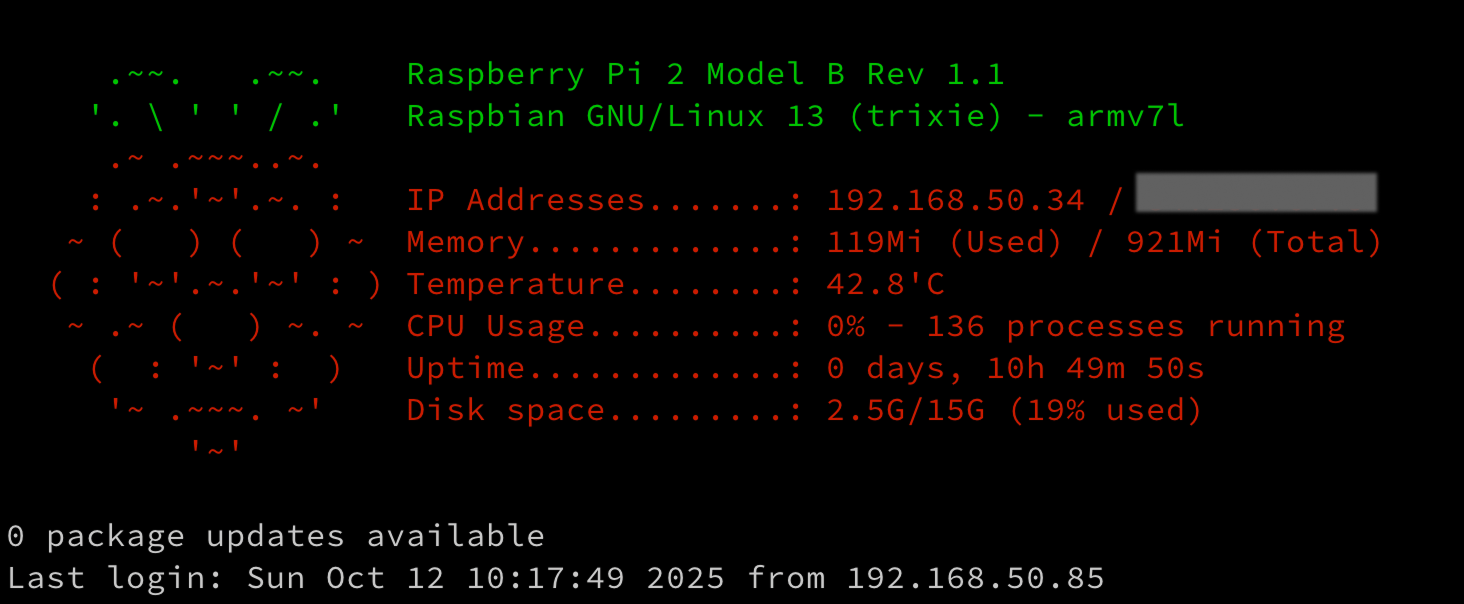 Remove the default GNU/Linux free software text and add your own custom message with system information. Tested with Raspbian GNU/Linux 13 (trixie).